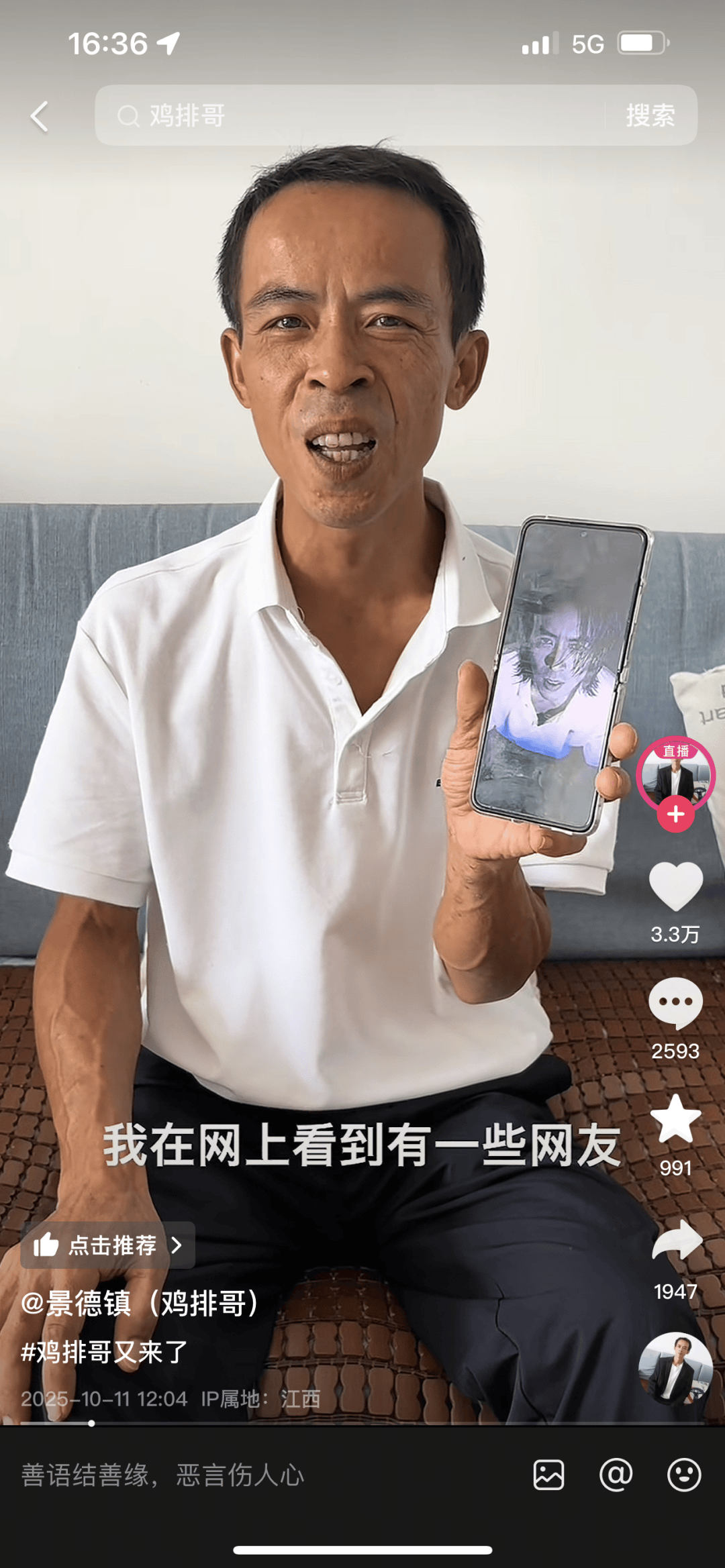 第三方数据显示,鸡排哥于9月23日在社交平台开设了个人抖音账号“景德镇(鸡排哥)”,截至10月12日下午, 总获赞519.4万,单条视频最高点赞达到110万。