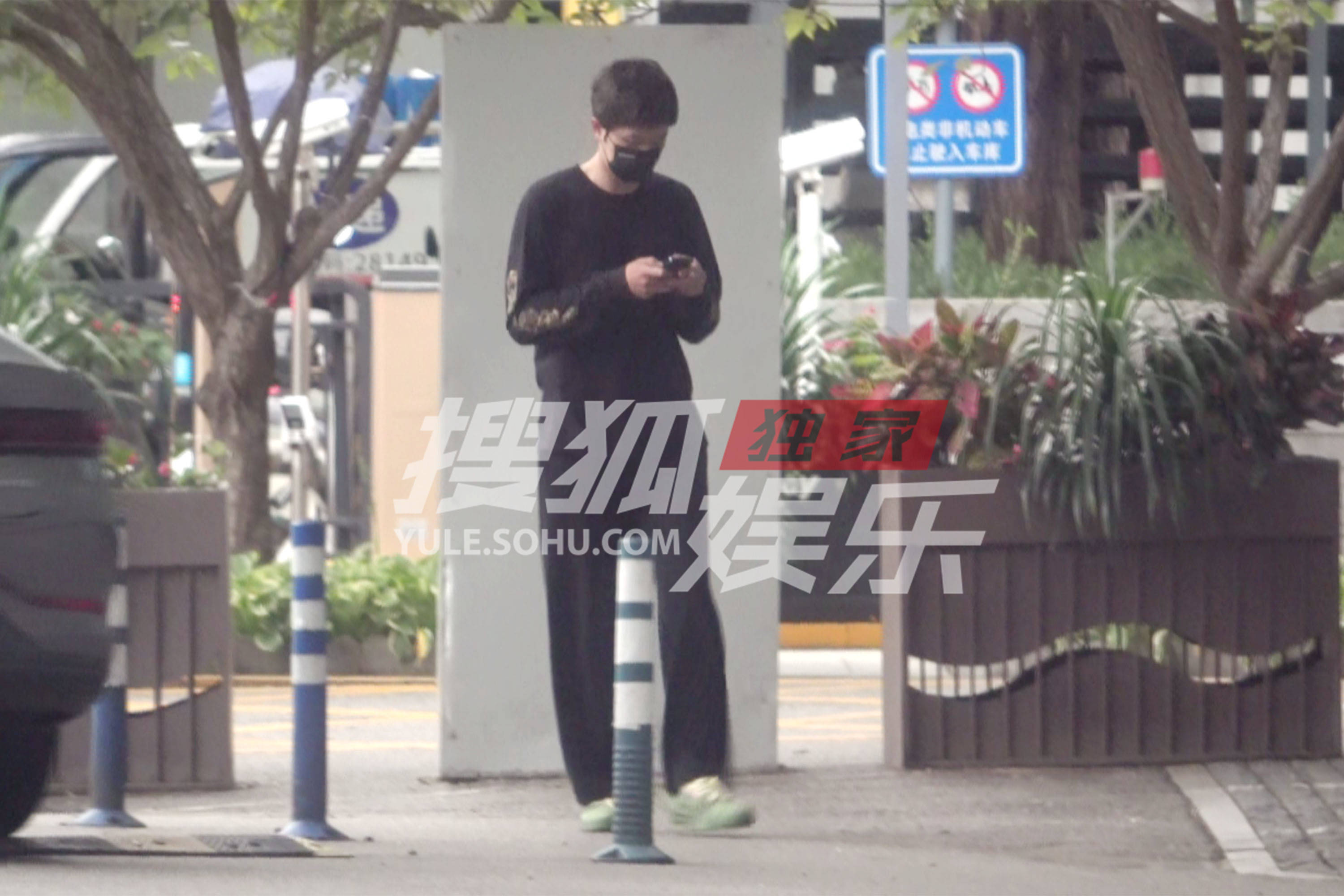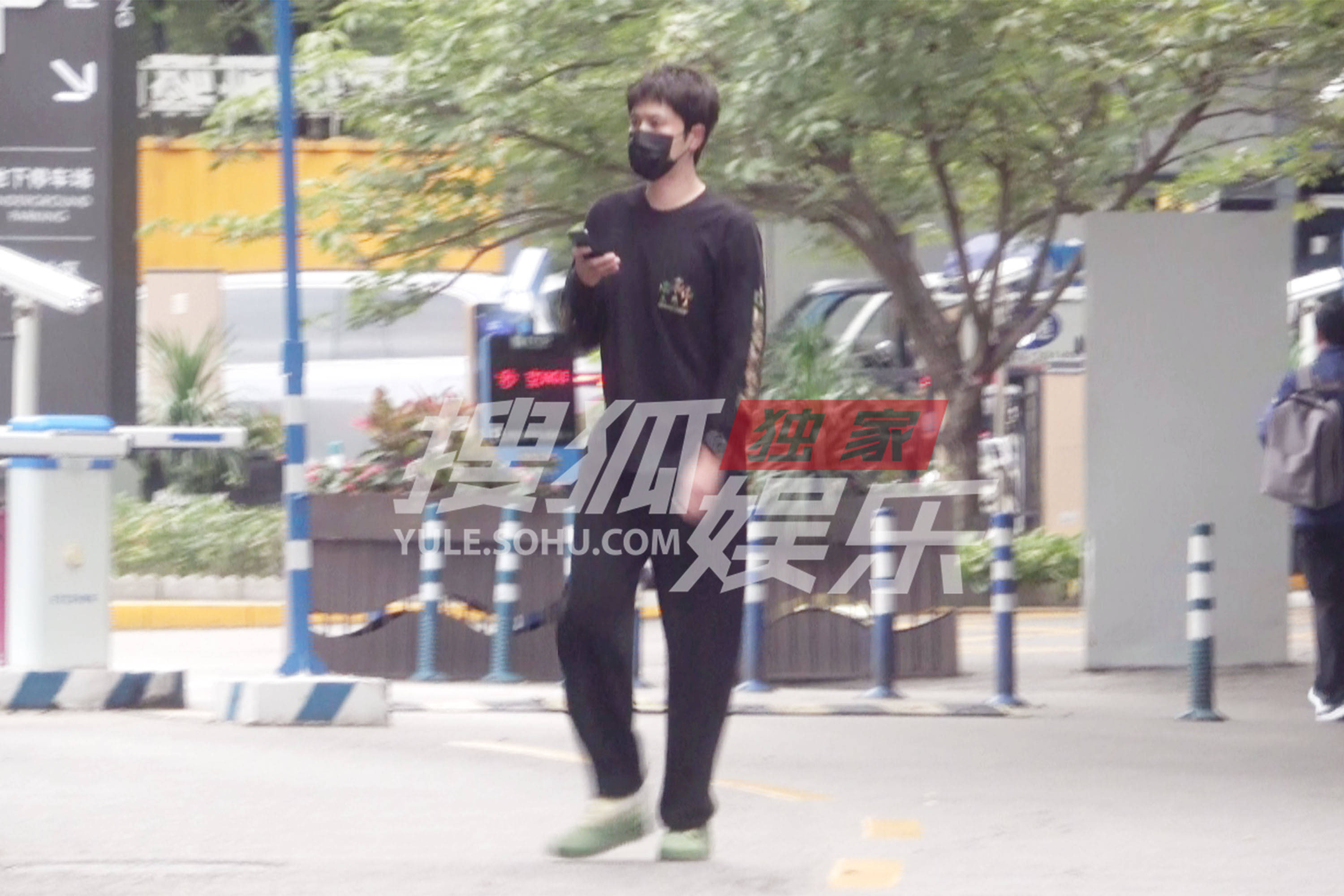 出门时,彭冠英低着头看手机可身高还是非常瞩目。