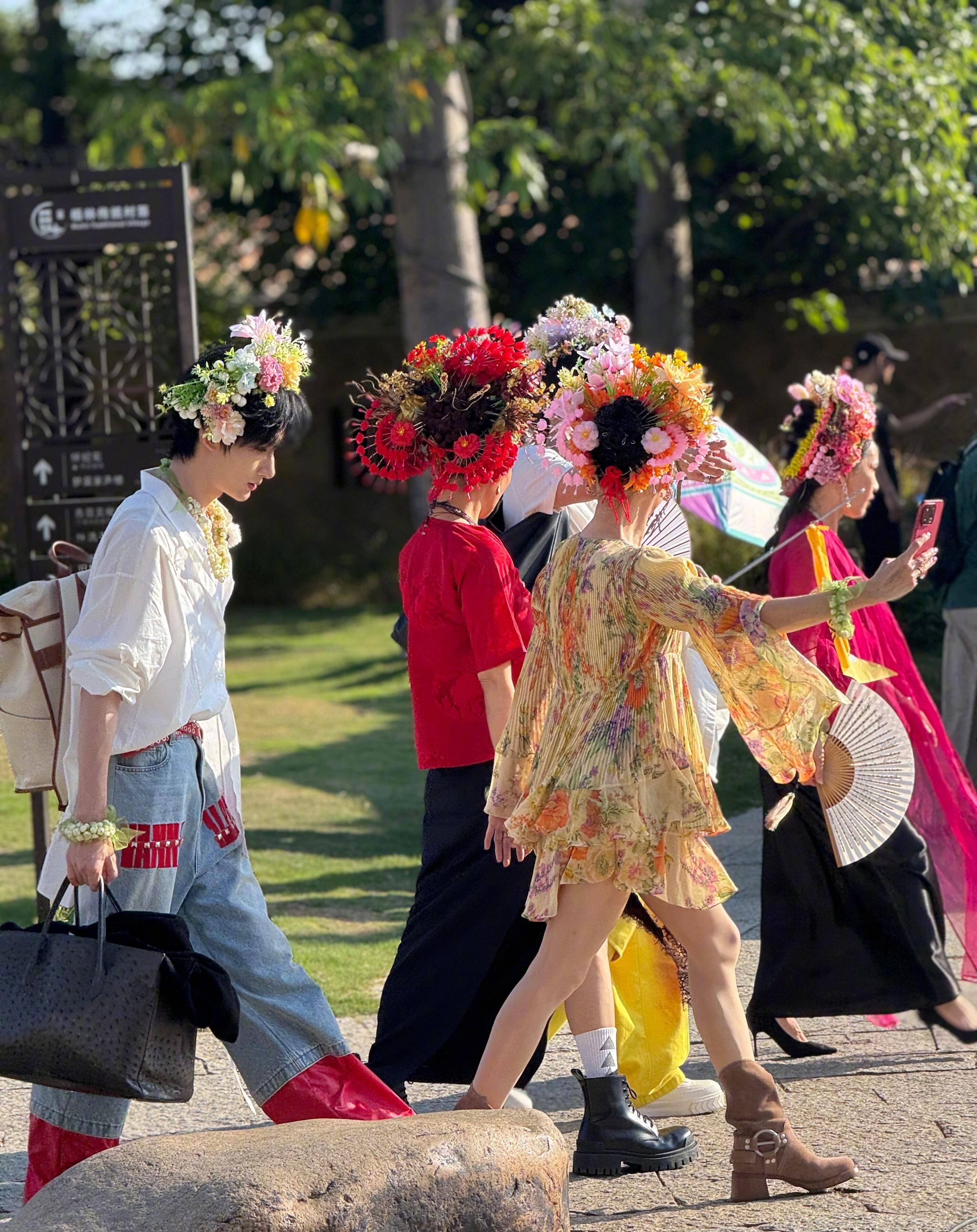 搜狐娱乐讯 近日,一组《一路繁花2》全员簪花造型路透图释出。图中,张柏芝头戴黄色簪花,穿碎花裙和宁静自拍,氛围有爱。