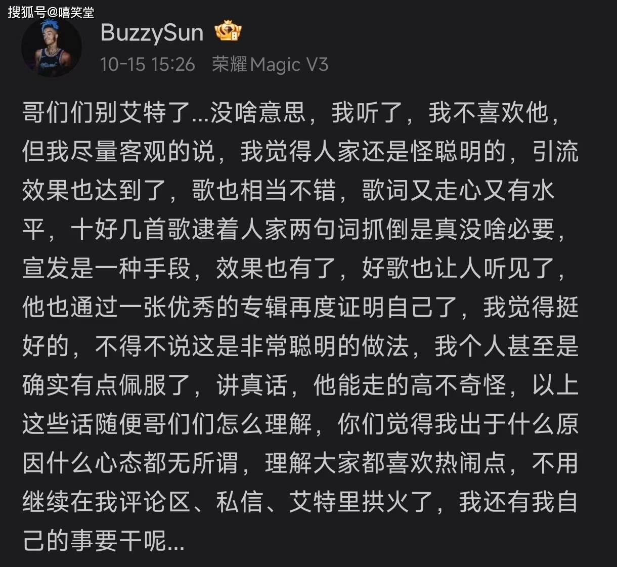 “我不喜欢他,但我尽量客观的说,我觉得人家还是怪聪明的,引流效果也达到了,歌也相当不错,歌词又走心又有水平,十好几首歌逮着人家两句词抓倒是真没啥必要,宣发是一种手段,效果也有了,好歌也让人听见了,他也通过一张优秀的专辑再度证明自己了,我觉得挺好的,不得不说这是非常聪明的做法,我个人甚至是确实有点佩服了,讲真话,他能走的高不奇怪”