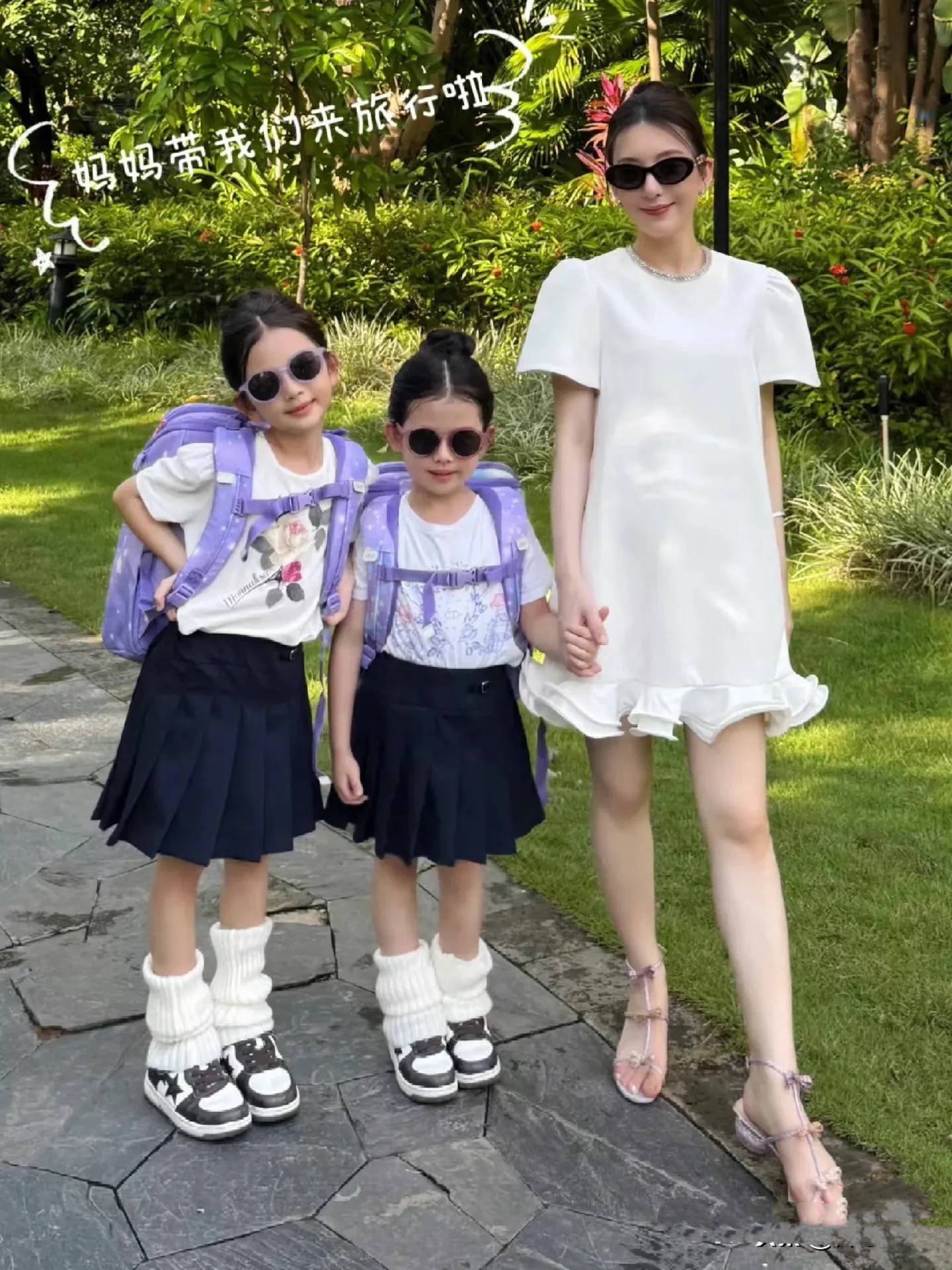 穿着小白裙、带着个性的墨镜,方媛身上的高级感太强了。她把两个女儿也打扮的很漂亮,可可爱爱的讨人喜欢。