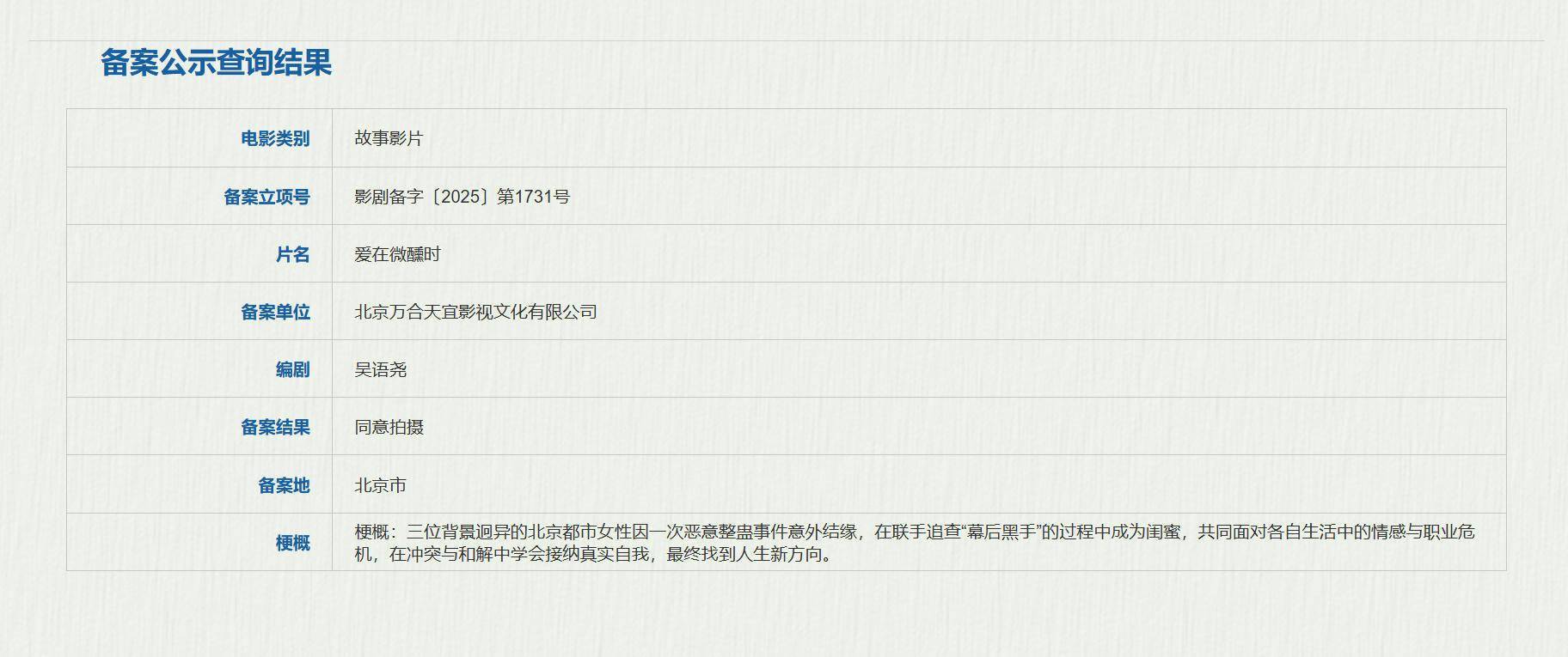 1905电影网讯据国家电影局关于2025年9月上全国电影剧本(梗概)备案、立项公示的通知,由吴语尧编剧的故事片《爱在微醺时》备案立项,备案单位:北京万合天宜影视文化有限公司。