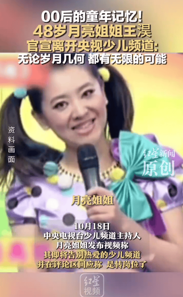 10月18日,中央电视台少儿频道主持人月亮姐姐发布视频称,其即将告别热爱的少儿频道,并在评论区回应称,是转岗位了。