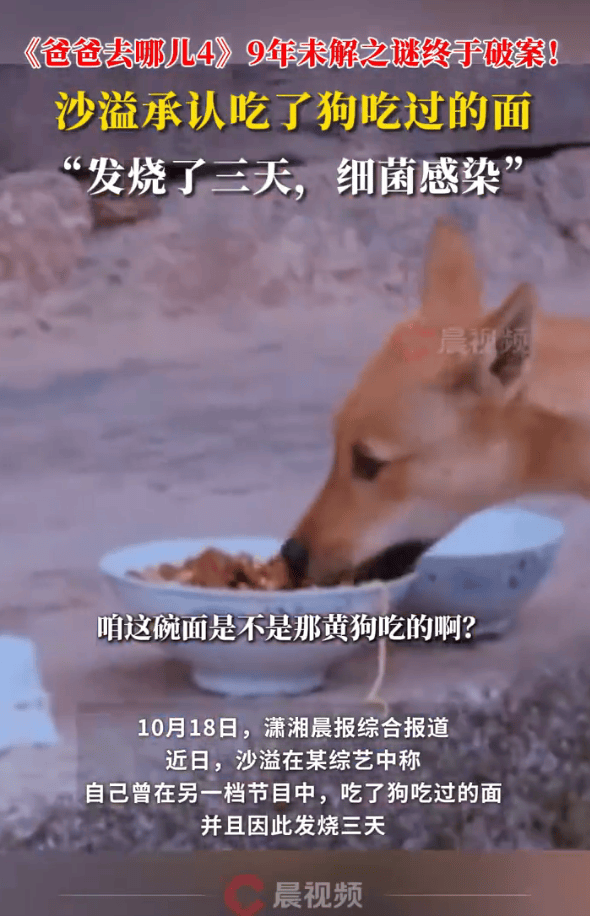 近日,沙溢在某综艺中称,自己曾在另一档节目中,吃了狗吃过的面,并且因此发烧三天。2016年《爸爸去哪儿4》录制中,沙溢与儿子安吉、小鱼儿在任务环节领取早餐面条时,其中一碗被路边小黄狗偷吃,“沙溢到底吃没吃狗吃过的面”被网友称为综艺未解之谜,9年来一直在网络被人讨论。