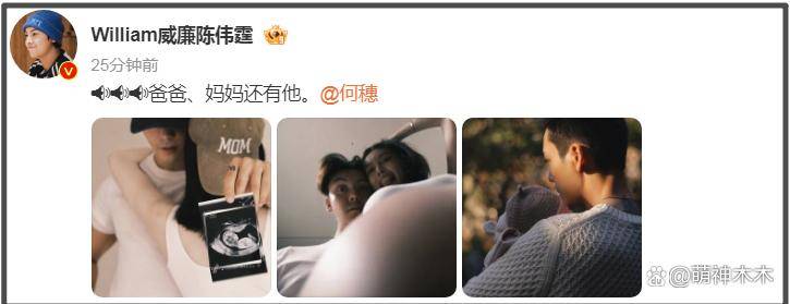 陈伟霆与何穗突如其来地同时晒出B超照、孕期照片和与儿子的合影,官宣成为父母。两人配文统一简洁甜蜜:“爸爸、妈妈还有他。”配上对称抱娃照,甜蜜指数爆棚。