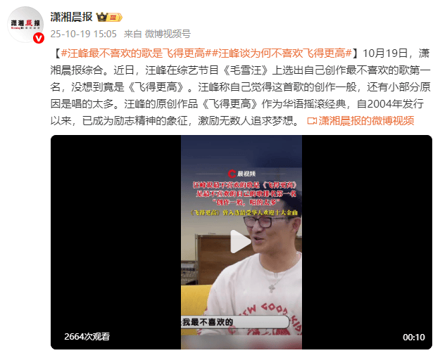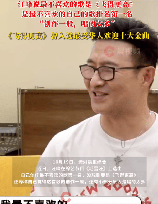 近日,汪峰在综艺节目《毛雪汪》上选出自己创作最不喜欢的歌第一名,没想到竟是《飞得更高》。汪峰称自己觉得这首歌的创作一般,还有小部分原因是唱的太多。