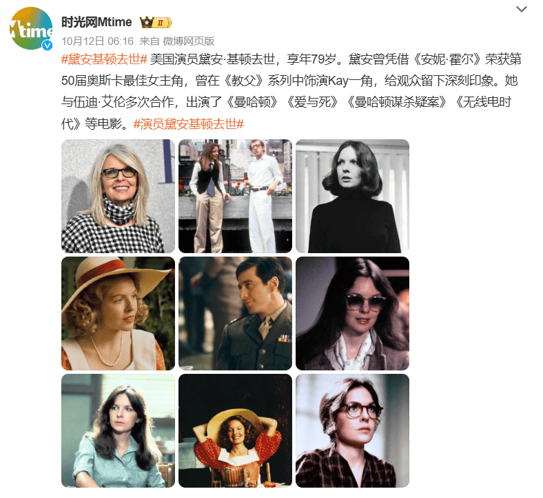 10月11日,奥斯卡影后黛安·基顿于家中离世,享年79岁。