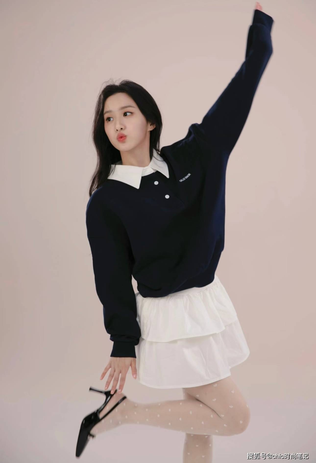 白色衬衫+黑色针织上衣+白色蛋糕短裙就很有miu系风格,经典的白+黑+白的穿搭让色系层次感十足,视觉上带来更大的时尚效果。