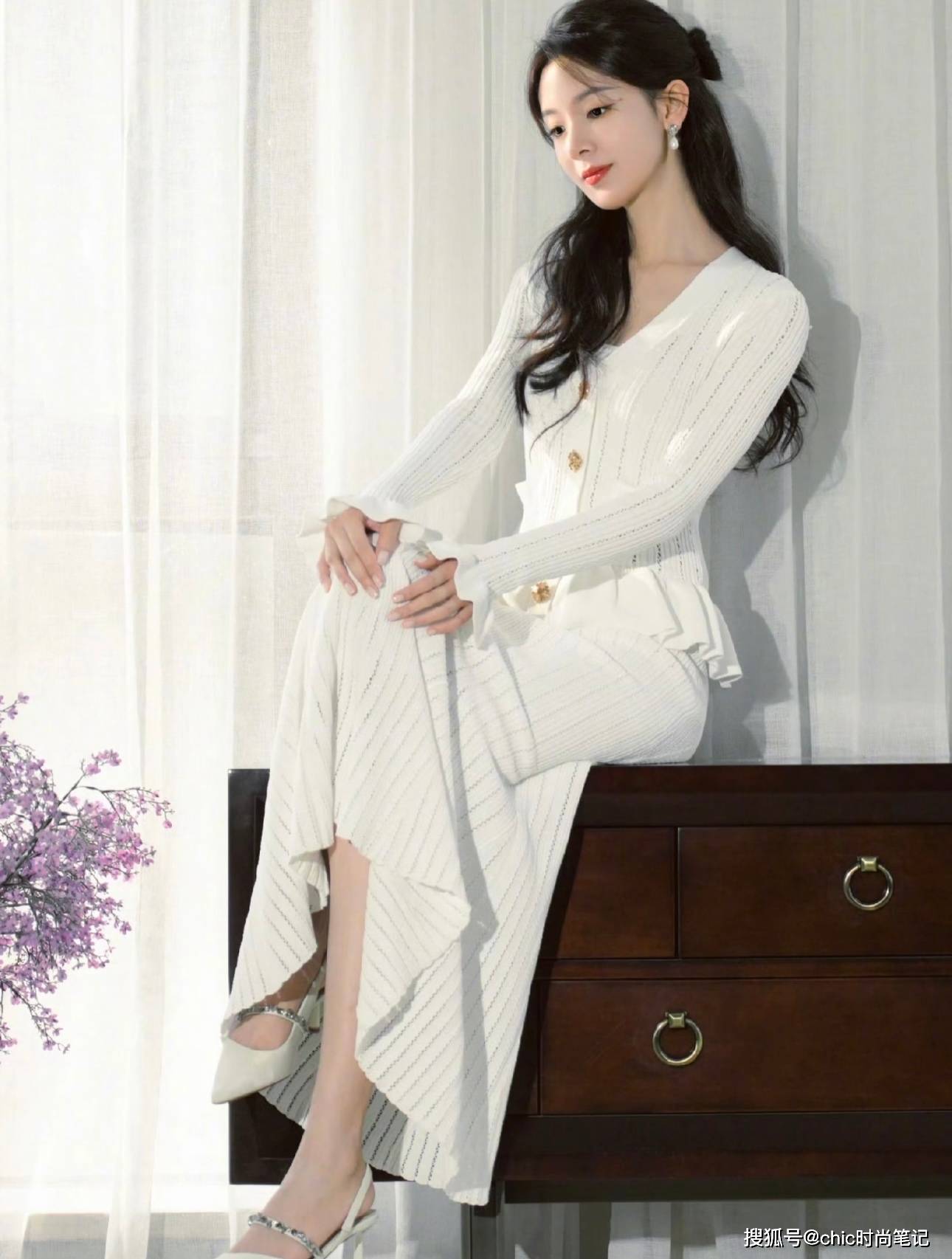 陈瑶的日常穿搭还是偏温柔、淑女,一身纯白色针织上衣+半身长裙把优雅和知性展现的淋漓尽致。配上蝴蝶结发饰和高跟鞋,太有气质了!
