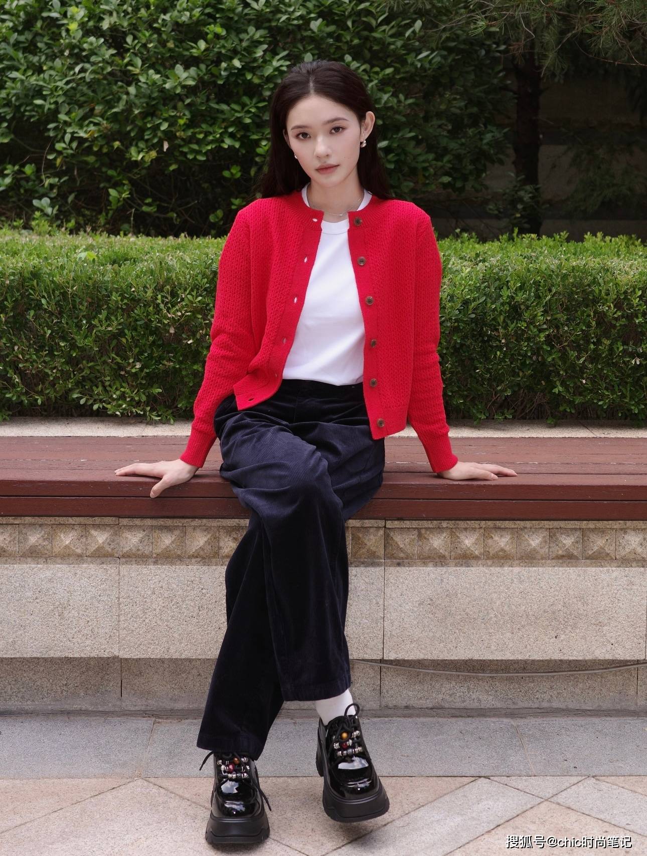 白色T恤+红色针织衫特别显白显气色,下身可以搭配长裤or长裙都很温柔,很有知性大姐姐的优雅气质。
