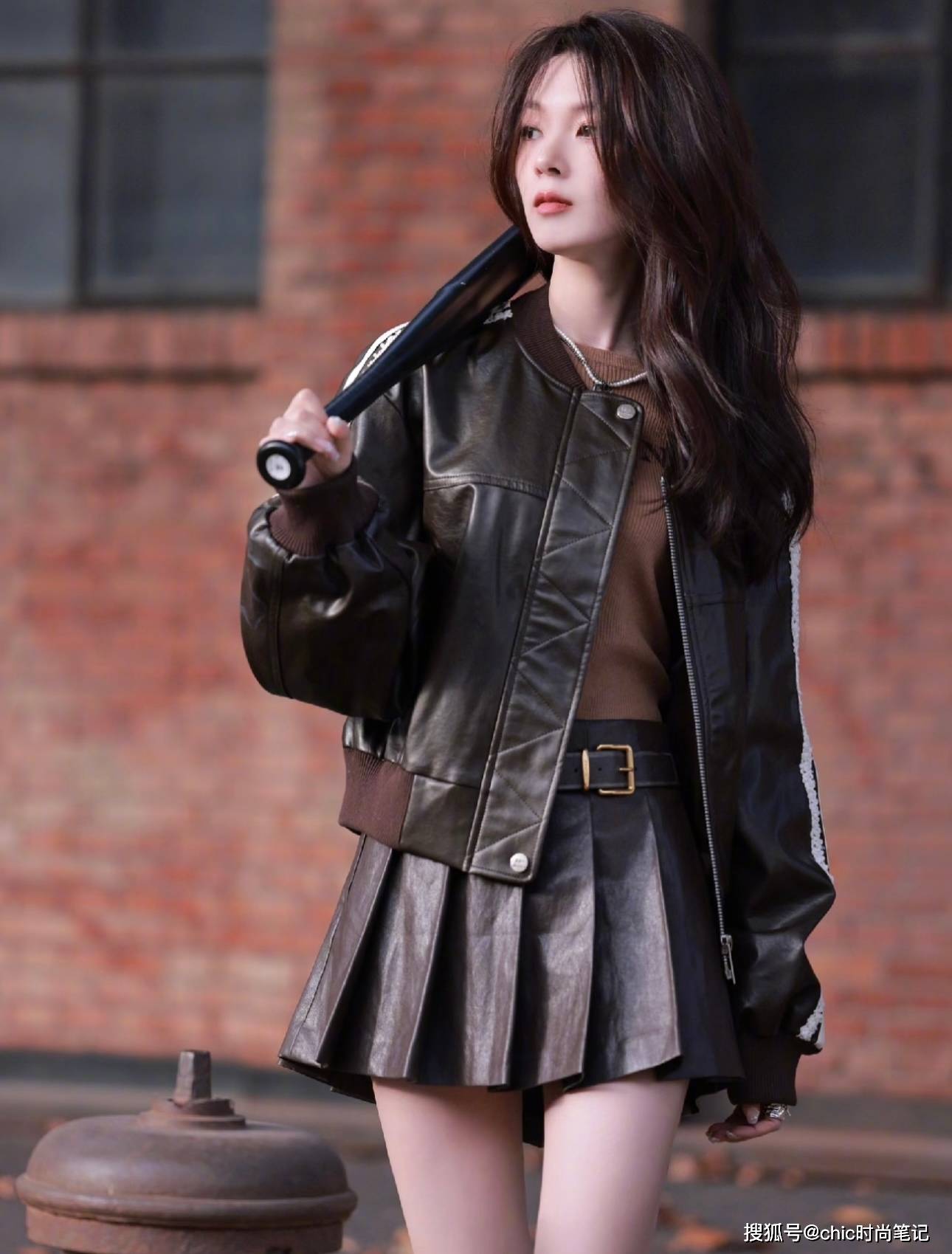 秋装少不了皮衣的加持。棒球皮外套+皮质百褶短裙,复古且摩登的感觉,有一种美式甜心的feel。