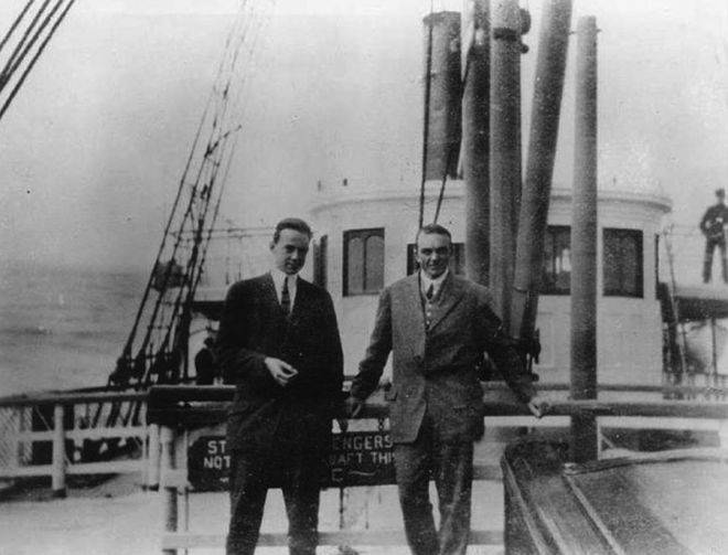 1906年10月16日,尤金·奥尼尔(左)在去往洪都拉斯的船上。当天正好是他的生日。 图片取自网络