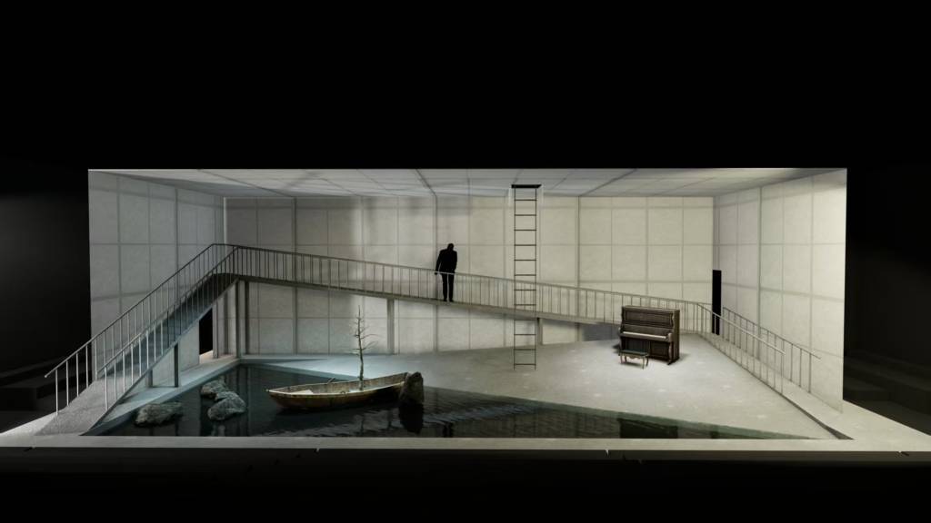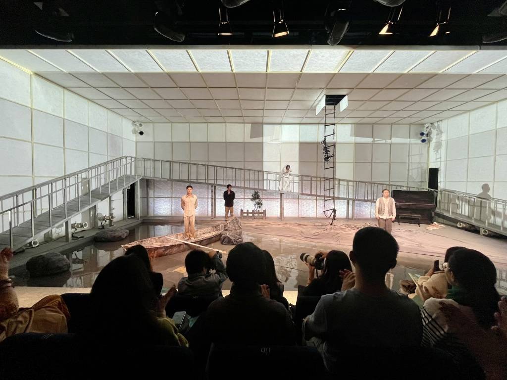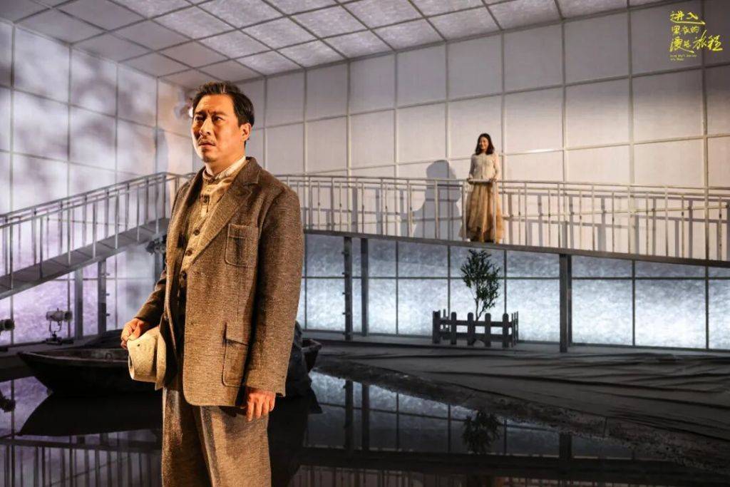与去年首演时一致,舞台依旧以写实与写意兼具的风格呈现。雾气、朦胧灯光、白色舞台、倾斜地面与水池等元素被保留,而象征海上漂泊的孤舟、围合式的回廊结构,则强化了角色无法逃脱的宿命感。