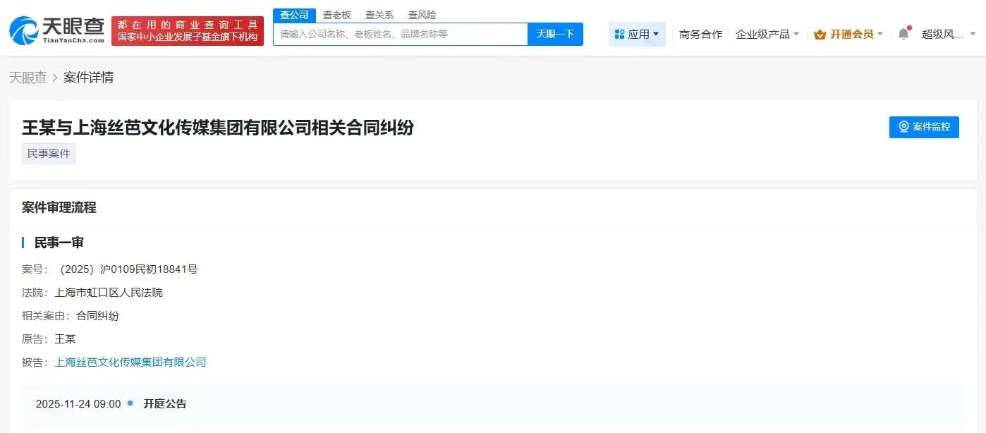 搜狐娱乐讯 近日,据天眼查天眼风险信息显示,上海丝芭文化传媒集团有限公司新增2条开庭公告,原告分别为周诗雨、王奕,案由均为合同纠纷,上述案件将分别于11月19日、11月24日在上海市虹口区人民法院开庭审理。据悉,周诗雨、王奕此前均为人气偶像团体SNH48成员,二人已于今年发文宣布解约。