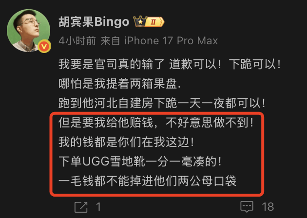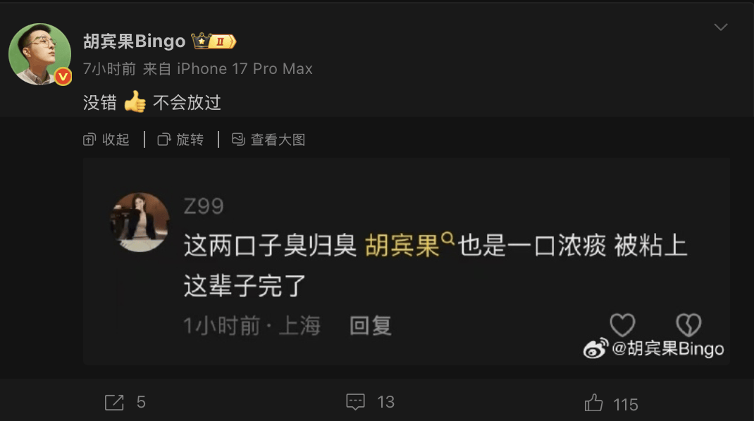 没多久胡宾果就发了条这样的微博,本来笑笑也就过去了。