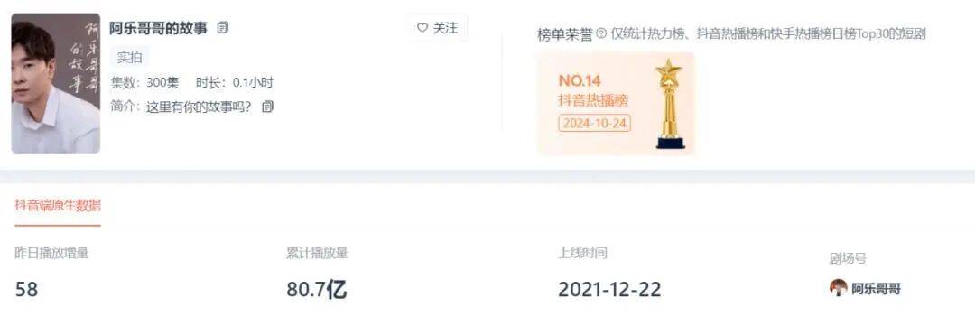 从播放数据来看,乡村题材微短剧在各大视频平台和社交媒体上收获了极高的关注度。例如《家里家外》,豆瓣评分7.9,播放量高达24.97亿 ,上线48小时话题量破5亿,。以四川农村家庭为背景,融合方言、年代元素,被《人民日报》评价为“用温暖叙事传递乡村情感”。还有《阿乐哥哥的故事》播放量超80亿,带动抖音“乡村短剧”话题播放量接近100亿。这些数据充分表明乡村题材微短剧拥有庞大的观众群体和强大的市场潜力。