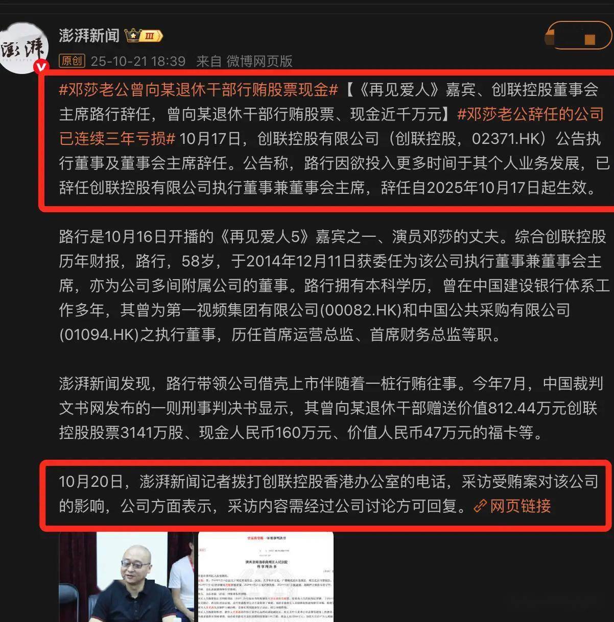 路行的争议远不止于婚姻观。节目外,他复杂的商业背景与涉嫌行贿的丑闻浮出水面,彻底颠覆了“成功企业家”的人设。路行曾在中国建设银行北京分行任职19年,官至副行长,后转战资本市场,历任港股上市公司第一视频集团执行董事、创联控股董事会主席。他通过资本运作控股多家企业,自称“公司加起来有百家左右”,并多次增持创联控股股份,塑造了“商界大佬”形象。