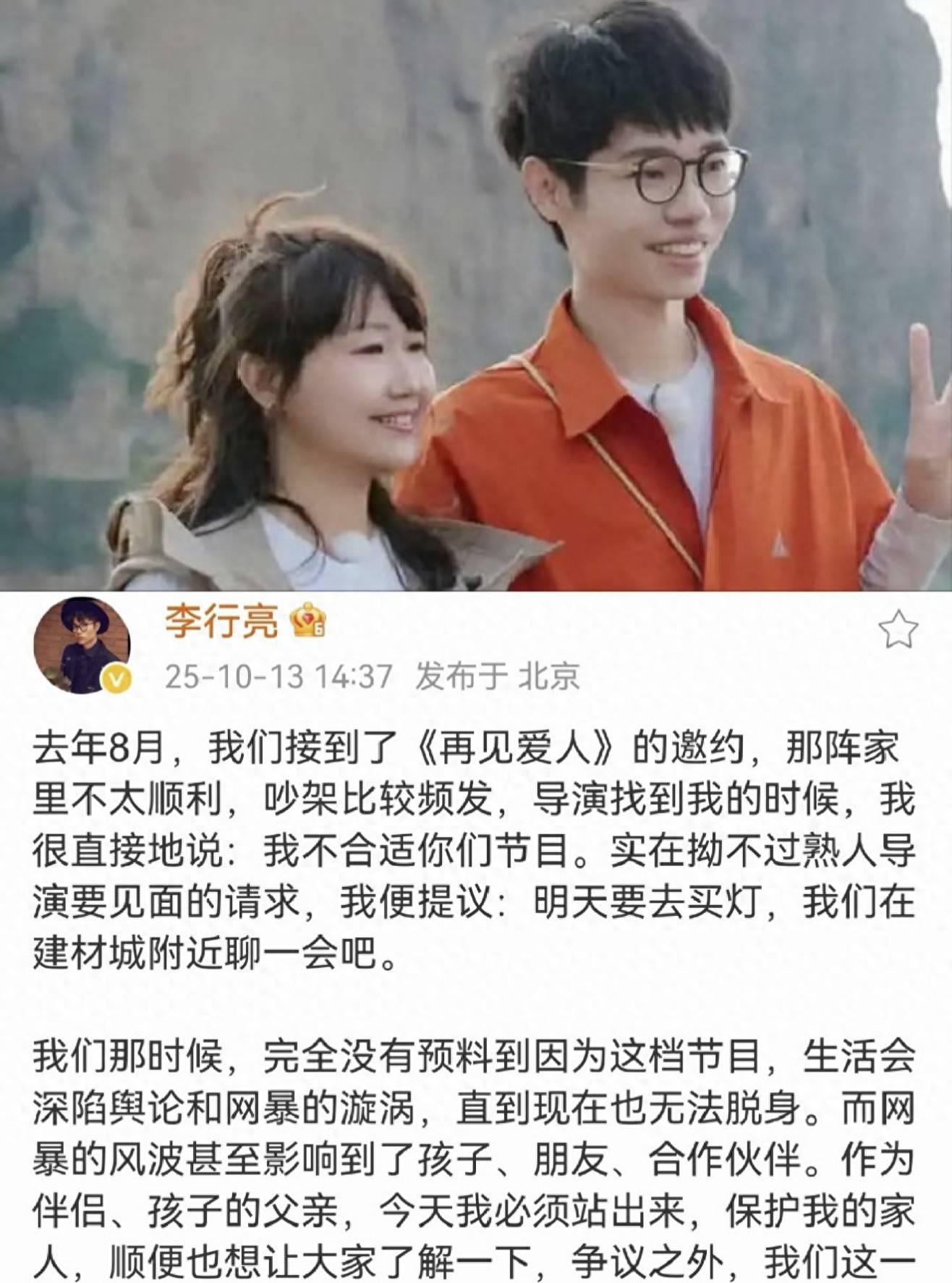 今年,李行亮在社交平台上公开了自己参加该综艺的初衷。他坦言,起初自己并不打算参演这样的节目,但由于制作人是自己的老朋友,一再劝说,他最终答应了。谁曾想,参加节目后,他不仅让自己陷入了舆论漩涡,甚至还连累了家人的名誉与事业。李行亮自觉,这个决定几乎让他和妻子承受了巨大的心理压力。夫妻二人几乎不敢出门,甚至在家里抱头痛哭,担心孩子在学校也会因此遭到欺负。