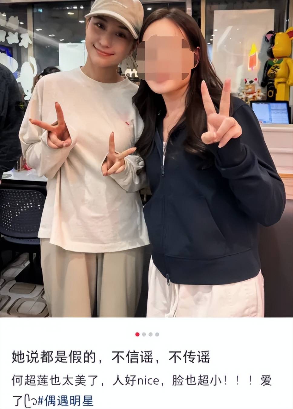 这位路人晒出一张与何超莲同框的照片,只见照片中的她穿搭低调简约,气色和心情都不错,对着镜头比手势,笑容甜美。这位路人还大赞何超莲很美,被问及近期传闻,直接表态:都是假的,不信谣,不传谣。