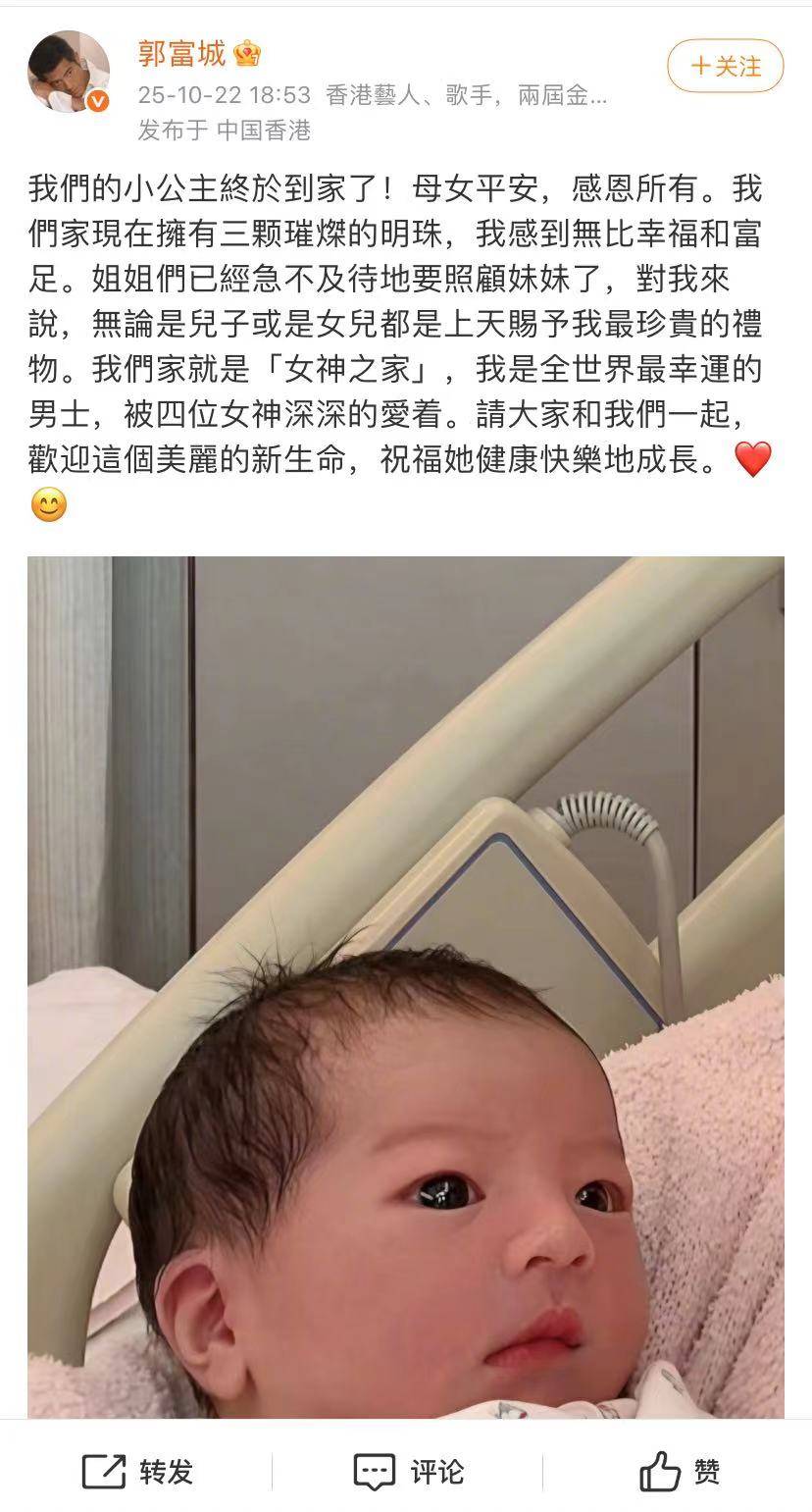 郭富城表示小公主终于到家了,母女平安,感恩所有,他们家现在拥有三颗璀璨的明珠,感到无比幸福和富足。姐姐们已经迫不及待地要照顾妹妹了,对他来说,无论是儿子或是女儿都是上天赐给他最珍贵的礼物。