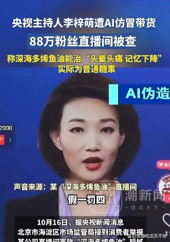 事情的起因源于一个粉丝量高达88万的直播间,画面里的“李梓萌”正在热情推荐一种深海多烯鱼油,并称其对头晕、头痛、记忆力下降等人群十分适合。直播间醒目的背景板和她熟悉的面孔,加上“央视主持人”的身份背书,许多消费者因此选择信任,纷纷下单,甚至有人专门为家中的老年人购买此产品。