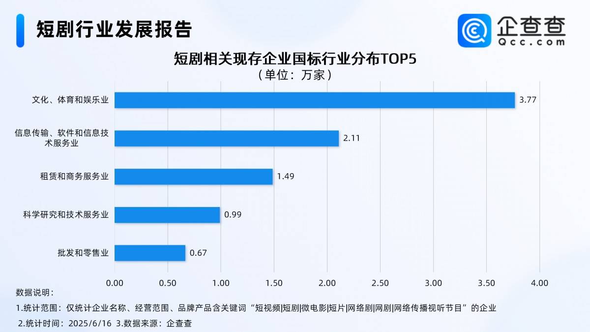 企查查显示,截至6月中旬,国内微短剧相关现存企业达9.54万家;其中文化、体育和娱乐业相关公司达3.77万家,这部分公司多数应该是内容相关。