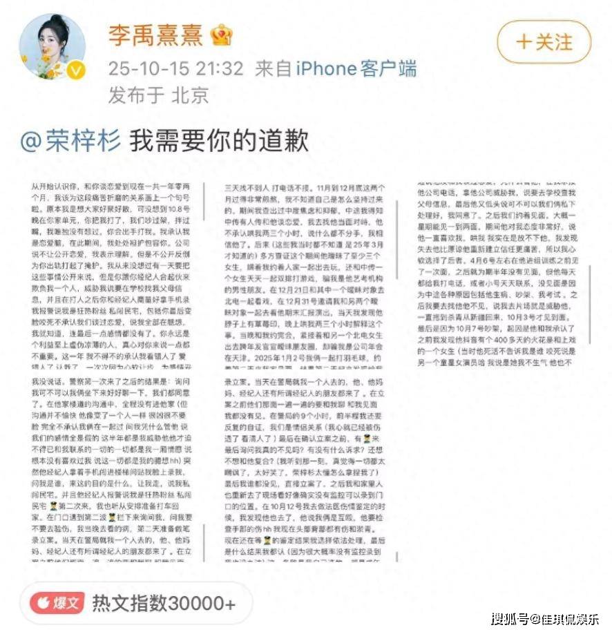 2025年10月,两人再次因为其他女生爆发争吵,李禹熹来到荣梓杉住处想要当面对峙,却发生冲突。