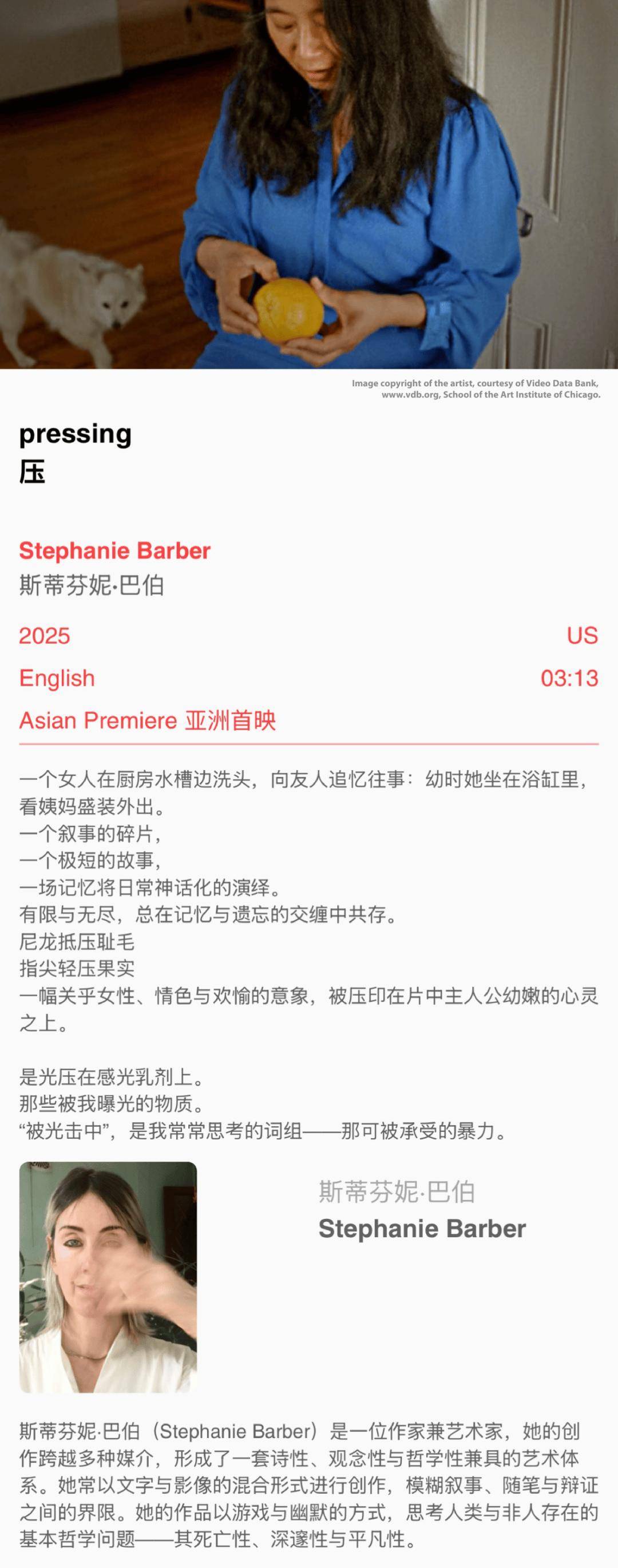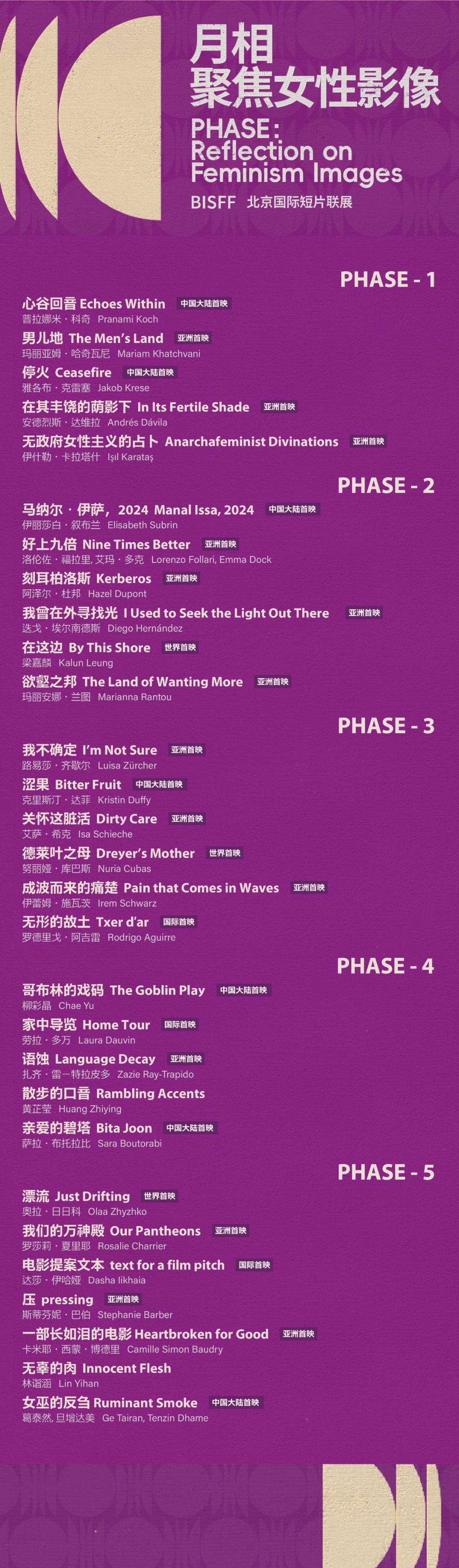 “月相:聚焦女性影像”(Phase: Reflection on Feminism Images)的二十九部影片,以各自独特的影像语言回应身体、欲望、记忆与历史之间反复拉扯的张力。这些作品并不试图为“女性”确立一种稳定叙事,而是围绕破碎、摇摆与挣扎的时刻展开回望与言说。它们共同召唤出“月之暗面”的生活姿态——不执念于圆满,亦不惧缺憾,在变化与不确定中持续发出微光。