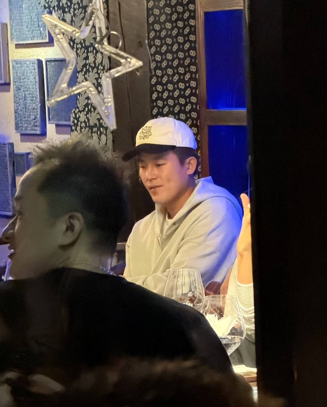 在非正式明星聚会中,他穿着卫衣搭配鸭舌帽坐在饭桌前认真听着别人讲话。