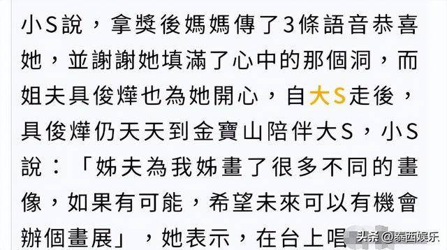 据小S透露,大 S 离开后,具俊晔一直没有离开台湾,每天都会给大S画画,“我有时候去姐姐家,看到客厅里堆着好多姐夫画的画,全是姐姐的样子,他说要攒够一定数量,让我帮他办个画展”。