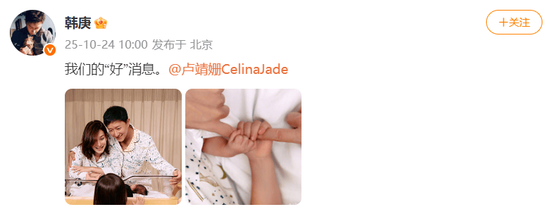 10月24日,韩庚、卢靖姗夫妇在个人社媒同步晒出一家四口合照、牵手照,并配文:“我们的‘好’消息”,官宣二胎出生。
