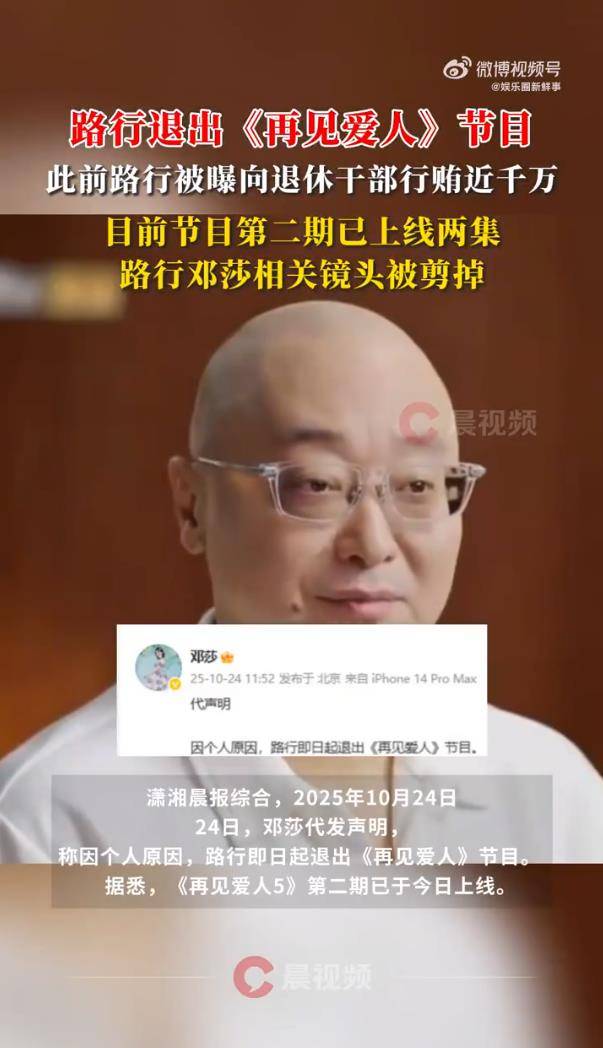10月16日,邓莎与丈夫路行(亦作陆行)以夫妻身份亮相节目首期,两人互动戏份占比超40%,围绕“丧偶式育儿”“长期半分居”等矛盾展开的讨论本是本季焦点。然而短短8天后(10月24日),邓莎突然通过微博代发声明,称路行因“个人原因”退出录制。此前一日,节目组已紧急推迟第二期上线,埋下伏笔。