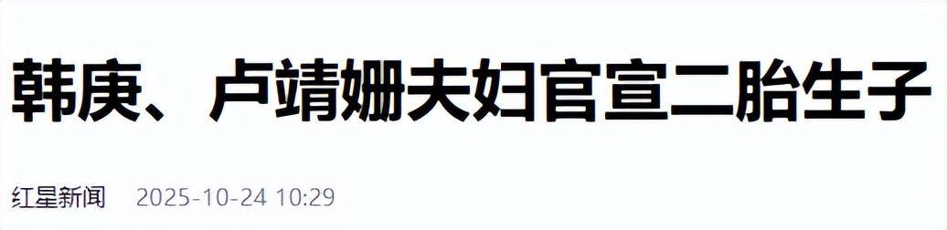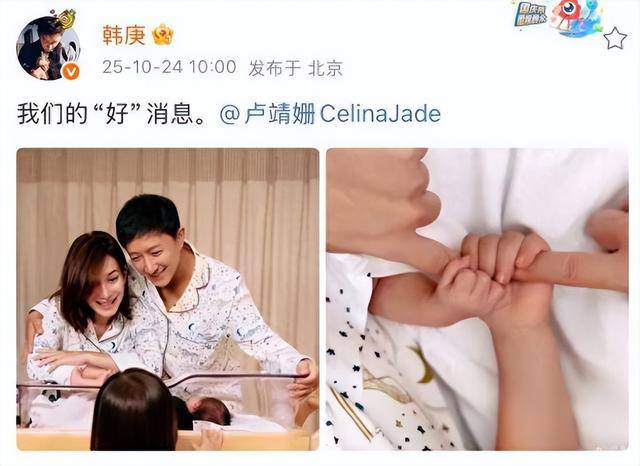 10月24日,韩庚与卢靖姗晒出一家四口牵手照,配文“我们的‘好’消息” 官宣二胎得子,评论区瞬间被 “儿女双全太圆满” 的祝福刷屏。