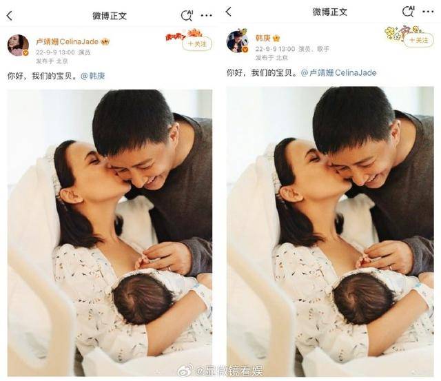 2022年9月,他们官宣首胎时,晒出的是卢靖姗亲吻韩庚脸颊、两人轻触女儿小手的照片,小家伙只露出头顶乌黑的胎发,韩庚配文“你好,我们的宝贝”。