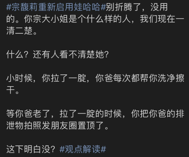 而当这个新闻出来后,我看到有一些网友,是这样评价宗馥莉的——可以说这个评价,真的是非常损了