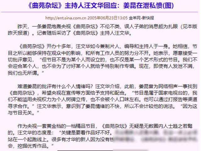 而姜昆为什么突然向这档节目开炮,有消息称,是姜昆在这之前想找汪文华商量,借《曲苑杂坛》这个平台宣传相声大赛,安排新人演出,但是却被汪文华给拒绝了。