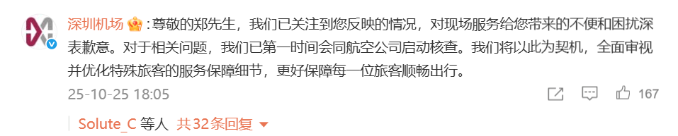 随后,深圳机场在评论区致歉,称对现场服务带来的不便和困扰深表歉意。对于相关问题,已第一时间会同航空公司启动核查。
