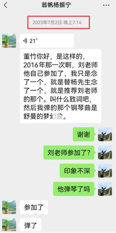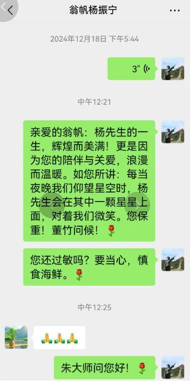 在杨振宁去世之后,董竹馆长向翁帆发出慰问,还细心的询问翁帆现在是否还海鲜过敏。