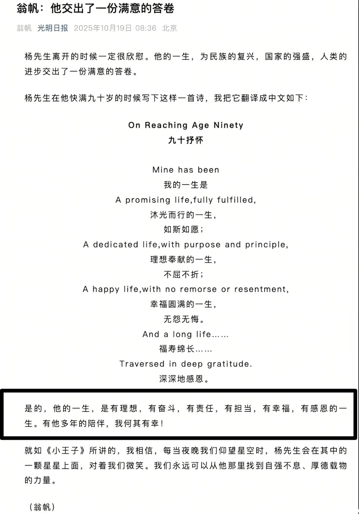 翁帆在文章中写到,杨振宁先生离开的时候一定很欣慰,他交出了一份满意的答卷。
