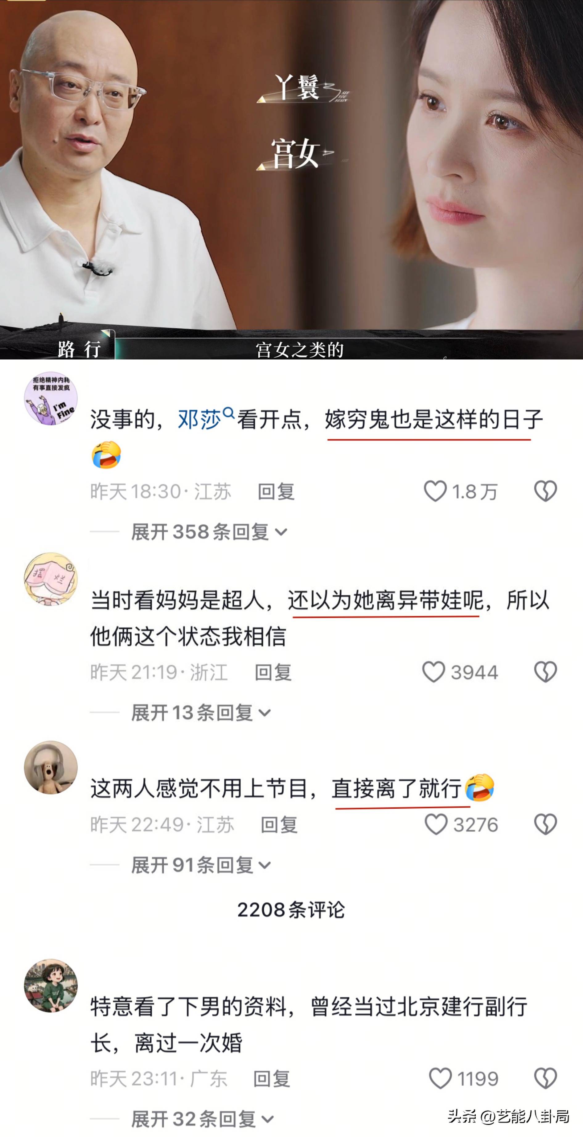 节目中的几对夫妻让人又笑又气,尤其是路行和邓莎这一对,他们就像是典型的“老夫老妻”,虽然相差18岁,结婚15年,但如今的关系仿佛已经进入了“丧偶式婚姻”的状态。路行是58岁,身为上市公司老总,而邓莎是40岁的女演员。两人曾因一段“奉子成婚”的故事走到了一起,但彼此之间的感情和理解却愈发疏远。尤其是路行,虽然已经是二婚,但从他嘴里说出来的,都是对妻子邓莎的“贬低”话语。邓莎虽然曾在《美人心计》《笑傲江湖》《知否知否应是绿肥红瘦》等剧中亮相,拥有不小的知名度,但在路行眼里,这些都没有值得骄傲的地方。