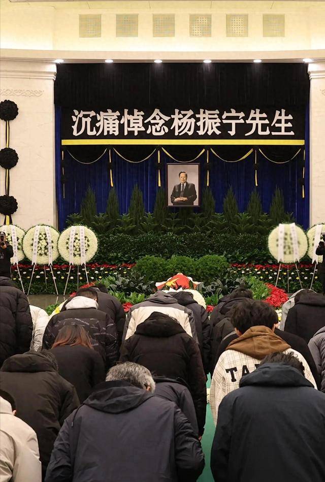 10月24日,杨振宁遗体告别仪式,现场庄严肃穆,妻子翁帆剪去长发,眼睛红肿,站在家人首位,悲伤溢于言表。
