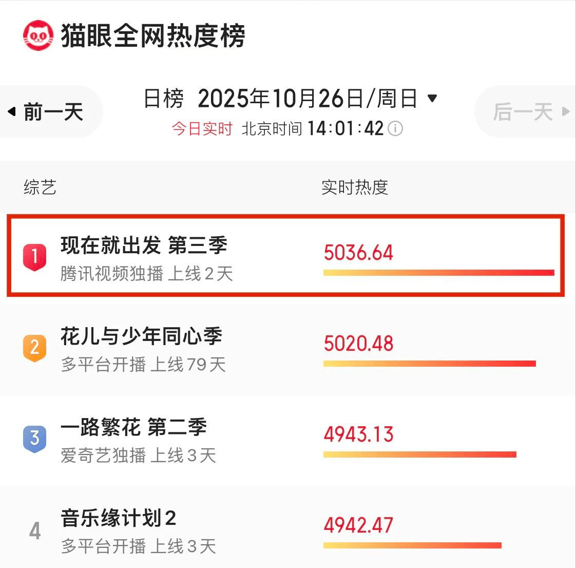 这份期待的兑现和纯粹的快乐,直接点燃了观众追综的热情。预约人数383万,创腾讯视频近两年综艺最高纪录;首播热度峰值破26000,创腾讯视频历史最快纪录。首播后,#现在就出发#、#王安宇同款饭搭子#、#白敬亭前有牵牛花今有挤肛腺#等话题词就登上热搜,节目抖音热度破亿。短视频、社交平台上,名场面切片不断被上传,关注播出节奏的新观众陆续涌入评论区。