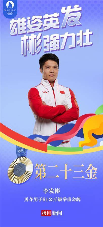 8月7日,在巴黎奥运会举重男子61公斤级比赛中,中国选手李发彬夺得金牌。这是中国代表团在本届奥运会获得的第23枚金牌。