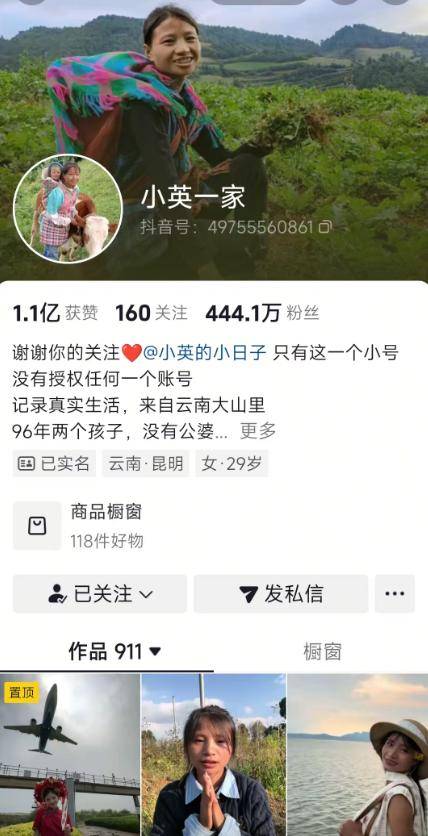 小英原名杨早英,出生于1996年,是自媒体账号“小英一家”所有者,她以记录云南农村生活走红。2022年10月19日,“小英一家”在抖音上发布了第一个作品。截至发稿,“小英一家”在抖音平台已有444.1万粉丝。