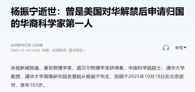 澎湃新闻 2025-10-18 杨振宁逝世:曾是美国对华解禁后申请归国的华裔科学家第一人
