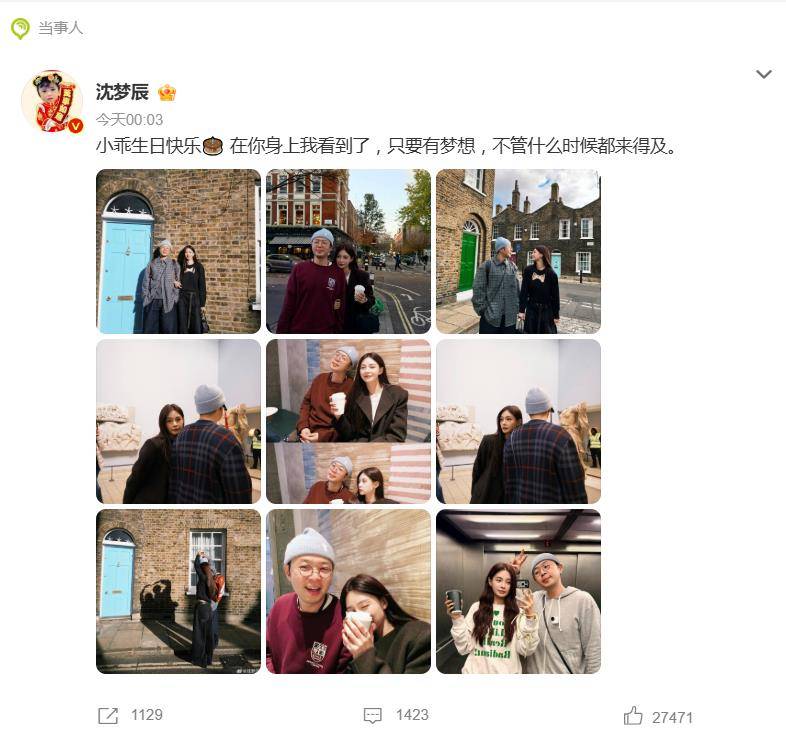 10月28日,沈梦辰一条微博准时为杜海涛送上37岁生日祝福,配文“小乖生日快乐,在你身上我看到了,只要有梦想,不管什么时候都来得及”,瞬间冲上热搜。