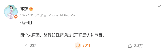 “代声明 因个人原因,路行即日起退出《再见爱人》节目。”10月24日上午,邓莎在个人微博上如是发文。