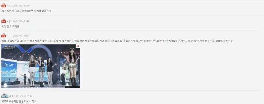 网友评论区也彻底沦陷为“彩虹屁现场”。有人精准点出:“或许因为个子小巧,她梳丸子头时简直像极了小仙女哈哈”,还有人狂赞“宛若精灵下凡,可爱度爆表”。更有人细致分析道:“全员虽都苗条,但Irene的骨架格外纤细。看到如此娇小的人总让人萌生保护欲呢~不过现实中她反而是经常照顾成员的大姐姐,这份踏实性格也很讨喜”。甚至有人直接感叹:“身形纤巧连脸蛋也惊人的小巧”——可以说,每一句评论都在反复认证:Irene的“小个子美学”彻底拿捏了视觉吸引力。