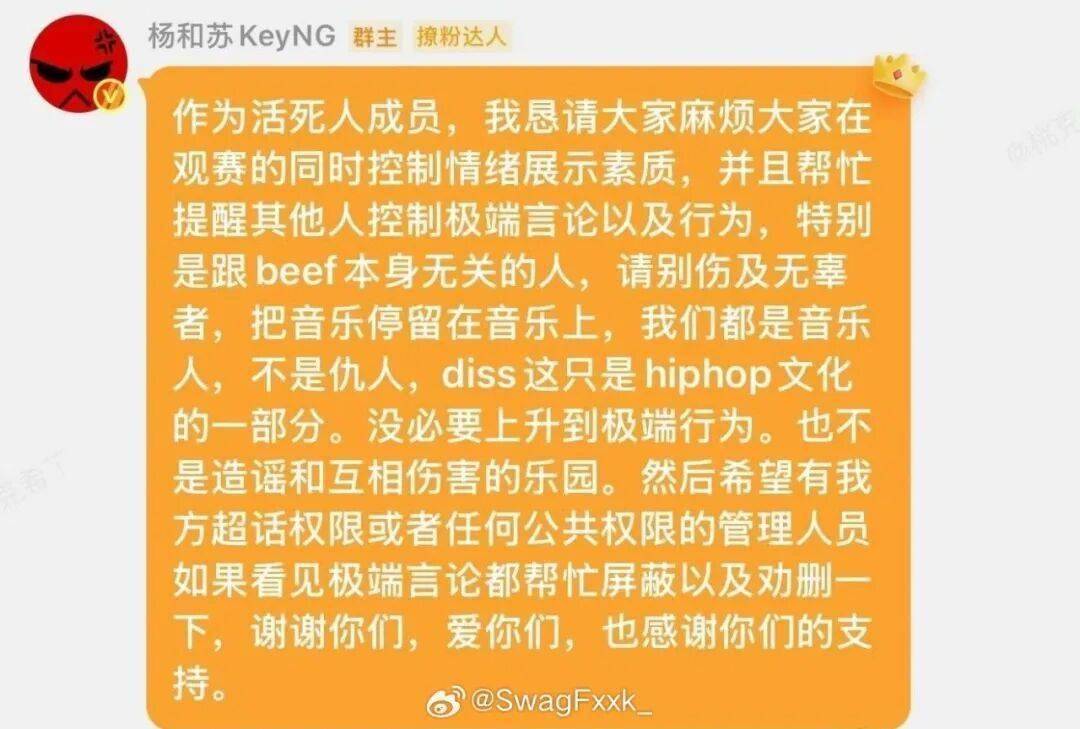 另外,杨和苏和活死人成员还在粉丝群喊话,表示要粉丝控制情绪,没必要上升到极端行为!