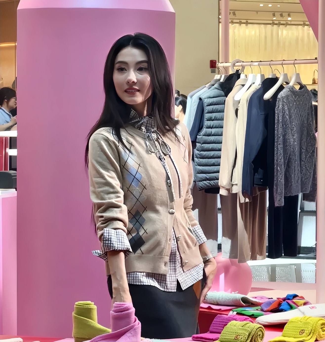 上周在重庆商场活动,穿件浅杏色毛衣,怼脸拍生图能打,网友都说"这状态比20年前演河东狮吼时还好"。